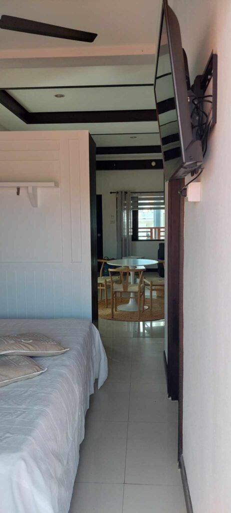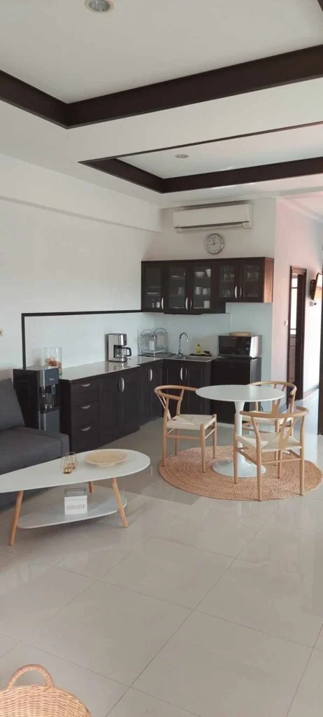 It’s open plan between the fully equipped kitchen and the living room which has a sofa for 3-4 people and a smart TV.